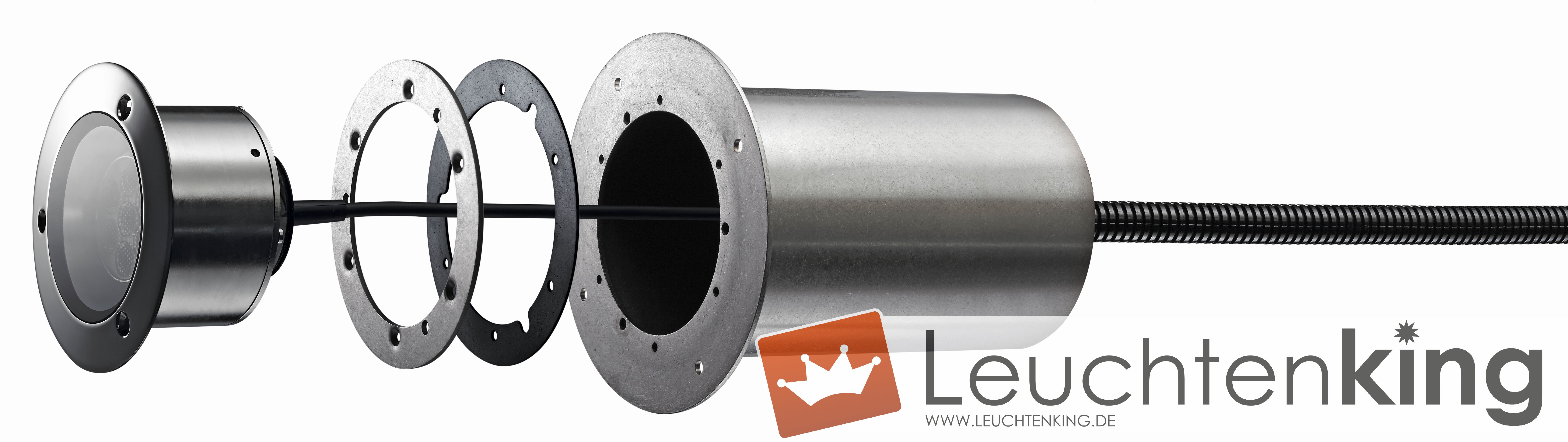 LED Einbaustrahler für Pools und Teiche; kompakte Bauform, nur 10 cm Durchmesser, mit THERMOPROTECT Überhitzungsschutz, dimmbar; Gehäuse V4A Edelstahl, hochglanzpoliert; IP 68; 24 V DC; 20 W; 2700 K; 1840 lm; 20°; CRI >80; 5 m PUR Anschlusskabel, offen; mit Montageschrauben; Abmessungen: H 100 mm x B 100 mm x T 75 mm